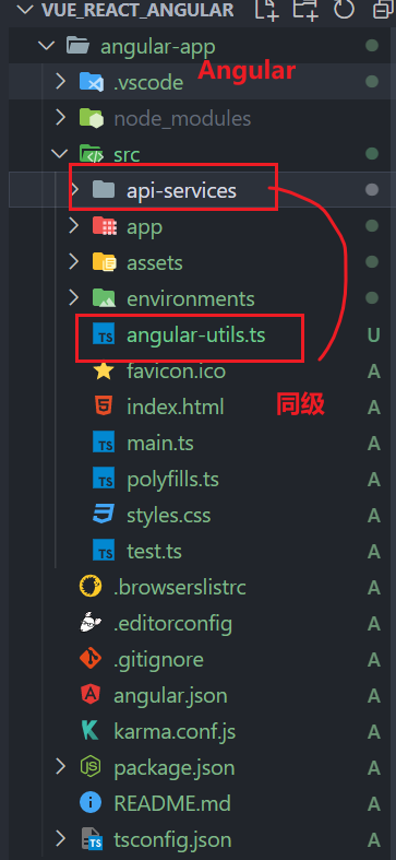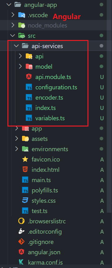 接着打开你的 Angular 项目,并在 src 目录下创建 api-services 目录并将刚刚复制的目录文件放在里面。