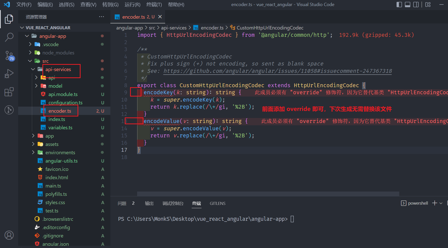 Angular 项目不能编译问题如果在 Angular 项目中无法编译通过,则需要修改根目录下的 api-services/encoder.ts 文件,并在 encodeKey 和 encodeValue 前添加 override 即可,如: