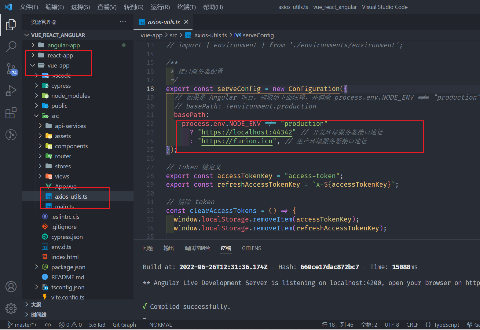 如果是 Angular 项目则编辑 Furion 框架提供的 angular-utils.ts 文件,并将 serveConfig 修改为对应的后端地址即可,如: