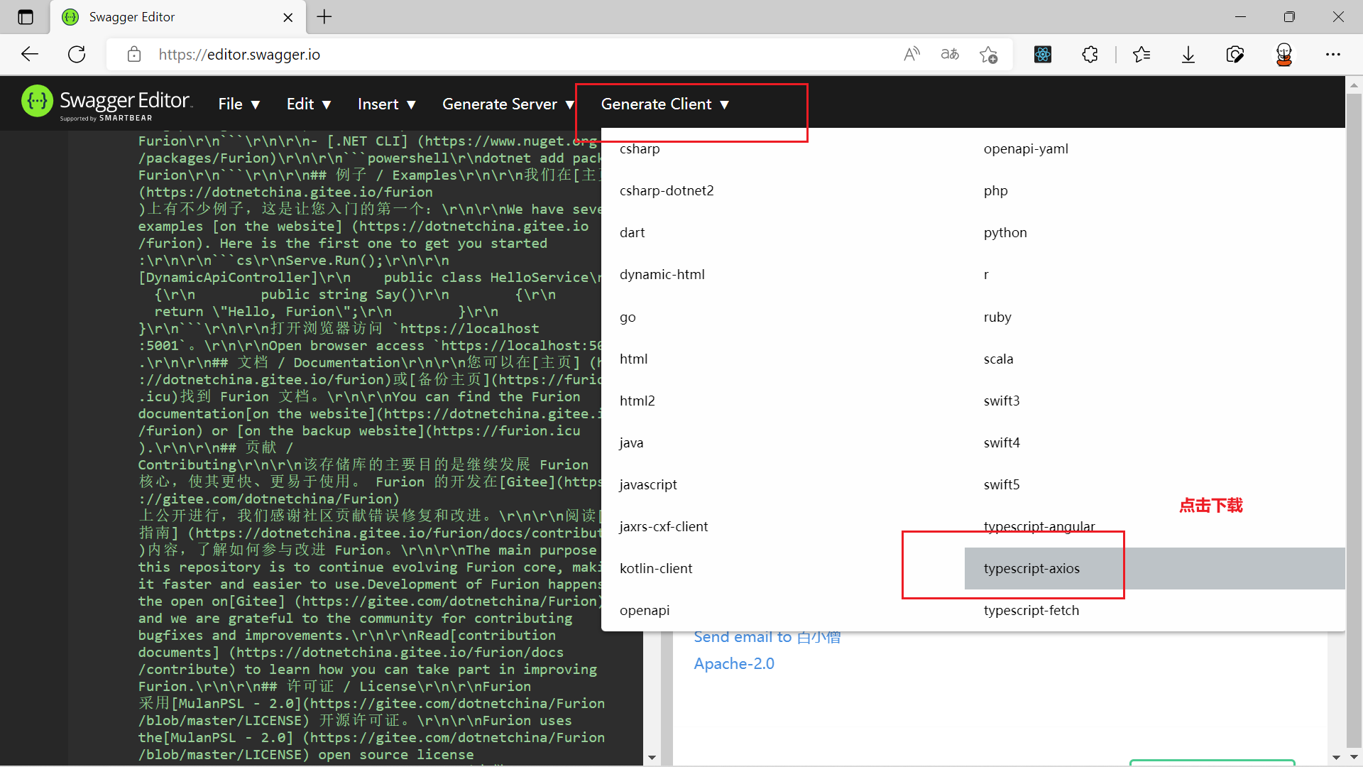 Furion 官网也提供了 Swagger-Editor.rar 离线包下载:https://gitee.com/dotnetchina/Furion/blob/v4/clients/Swagger-Editor.rar