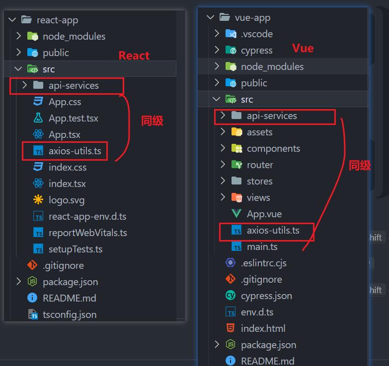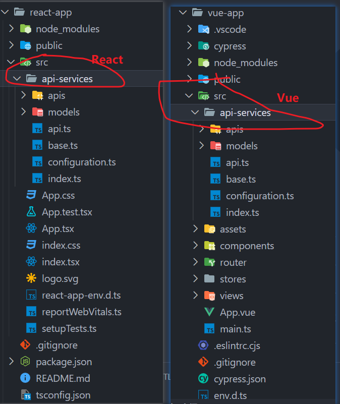 接着打开你的 Vue 或 React 项目,并在 src 目录下创建 api-services 目录并将刚刚复制的目录文件放在里面。