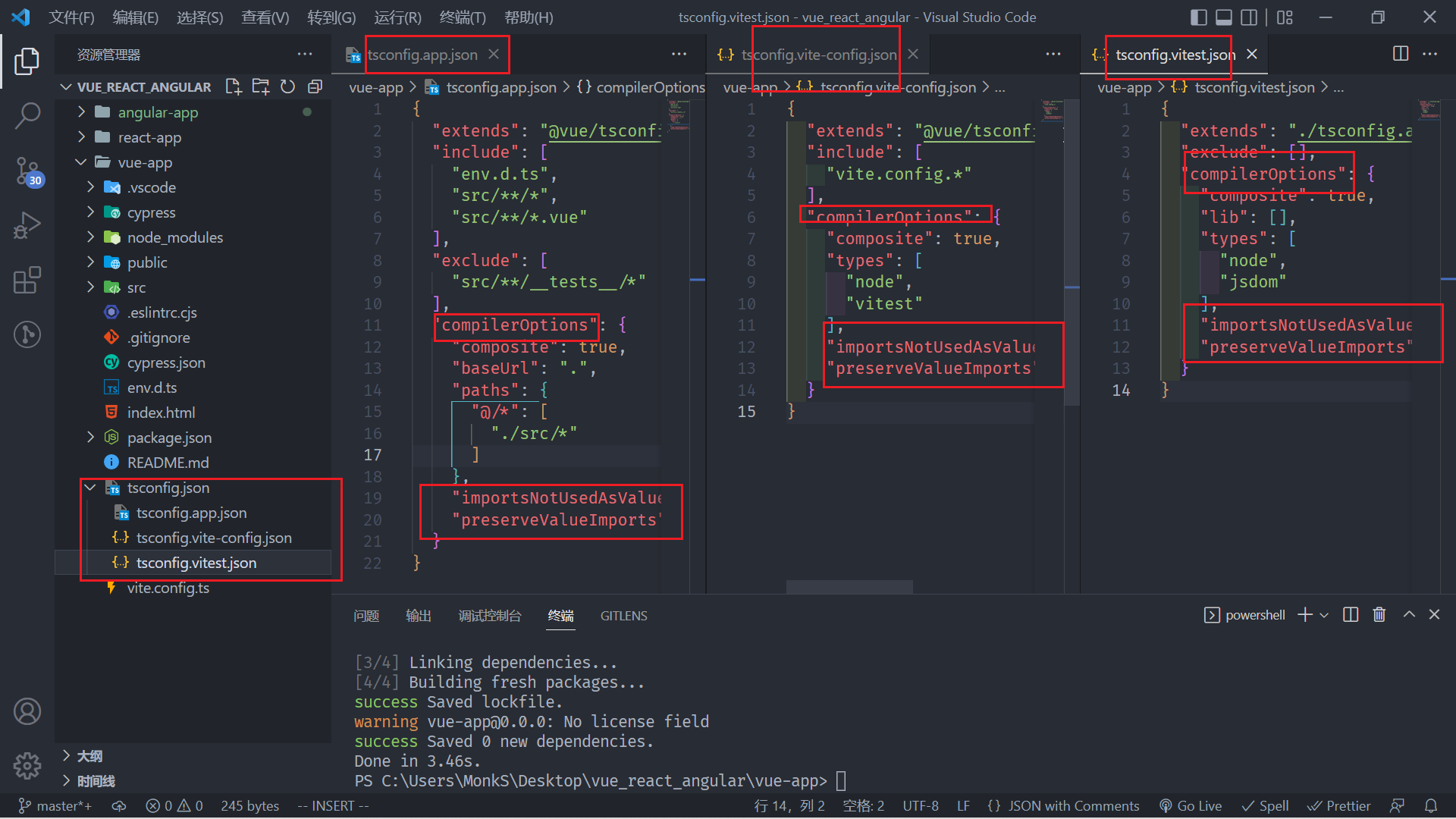 Vue3 项目不能编译问题如果在 Vue3 项目中无法编译通过,则需要修改根目录下的 tsconfig.app.json 和 tsconfig.vite-config.json 和 tsconfig.vitest.json 文件并添加下列配置即可,如: