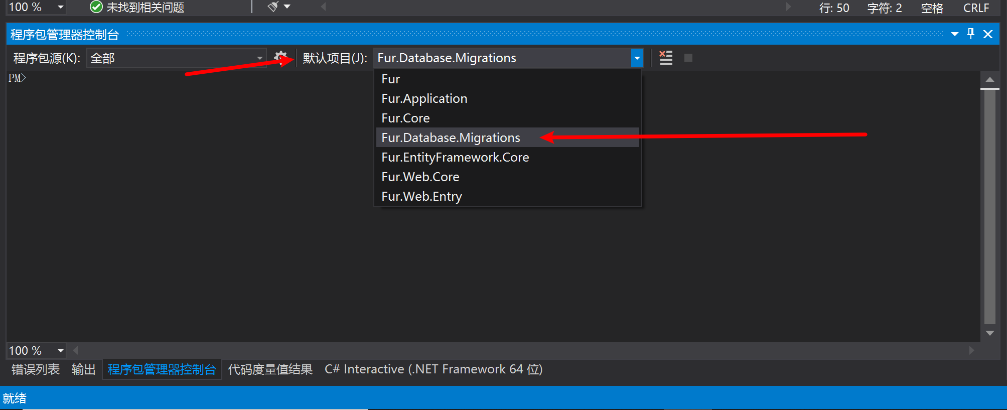 将 程序包管理控制台 默认项目设置为 Furion.Database.Migrations
