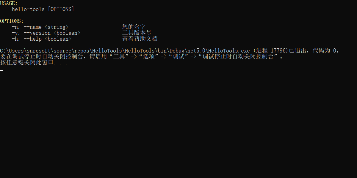 工具符:通常指的是你工具的唯一名称,也就是关键字,而且总是在最开头编写,如:dotnet,npm,node短参数:短参数指的是单个字符的字符串,我们通常使用-一个横杆指定参数及值,如:-v或-v 0.0.1长参数:长参数指的是一个或多个单词连接的字符串,该参数通常和短参数同时存在,通常使用--指定参数及值,如:--version或--version 0.0.1操作符:字符串中与参数值格式不匹配的任何文本都被视为操作数,任何出现在双连字符--之后且未包含在单引号或双引号中且两侧有空格的文本都被视为操作数,无论它是否与参数值格式匹配,通常用于归类/分类作用。