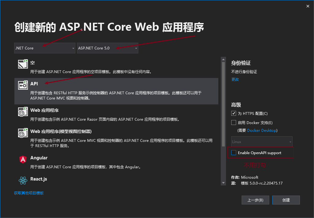 Furion 已经内置了 Swagger 规范化库,所以创建时无需勾选 Enable OpenAPI support 选项。否则提 示版本不一致产生冲突。