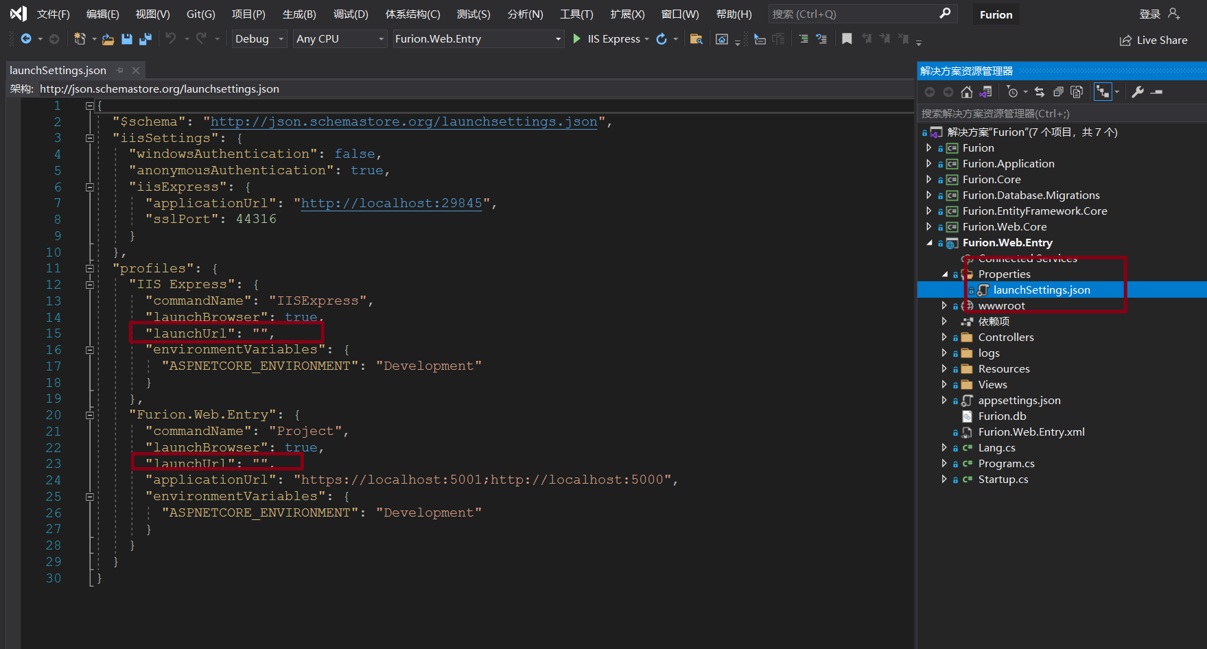 默认情况下,通过 Visual Studio 2019 创建的项目会自动配置了启动页,如果使用 F5 运行,可能不会自动打开首页,这时候我们只需要配置 launchSettings.json 的 launchUrl 即可: