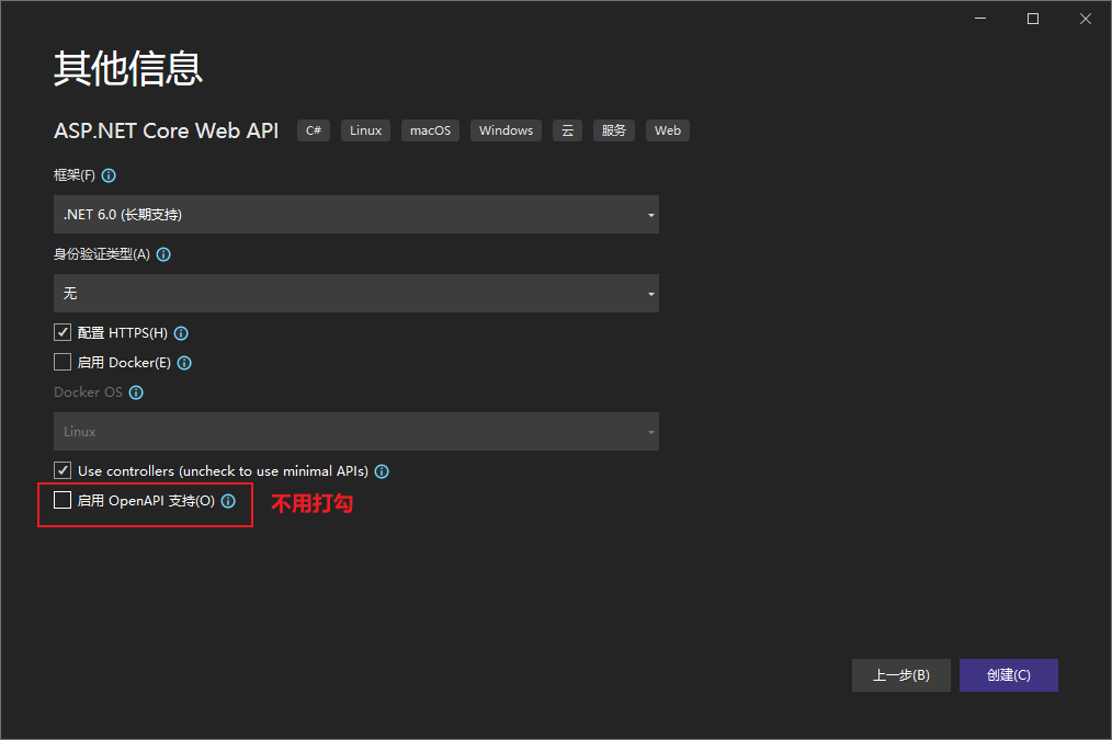 Furion 已经内置了 Swagger 规范化库,所以创建时无需勾选 Enable OpenAPI support 选项。否则提示版本不一致产生冲突。