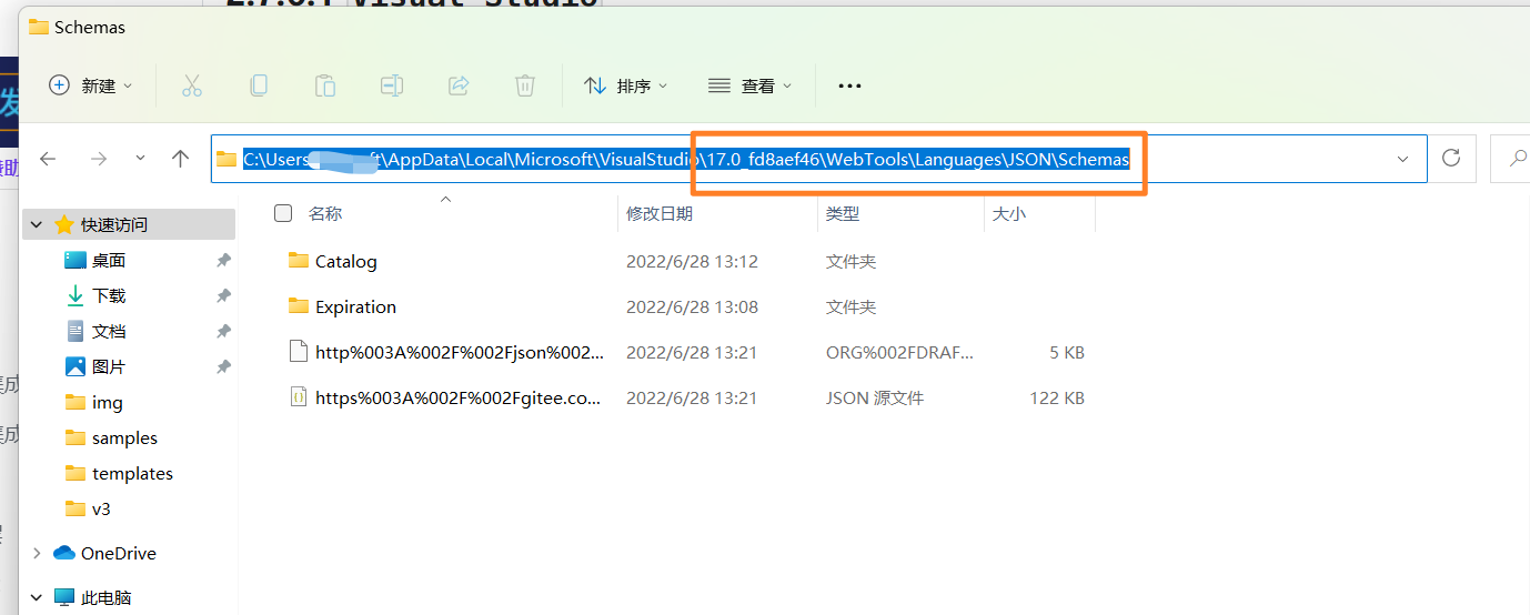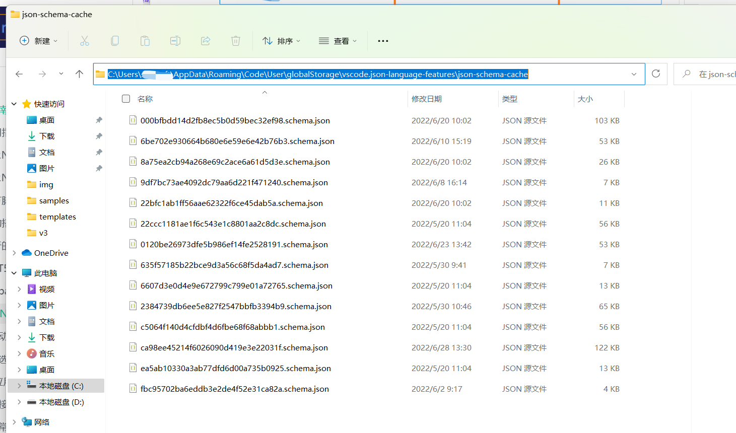 同上,运行进入 %AppData%,之后进入下列路径:C:\Users\你的电脑用户名\AppData\Roaming\Code\User\globalStorage\vscode.json-language-features\json-schema-cache