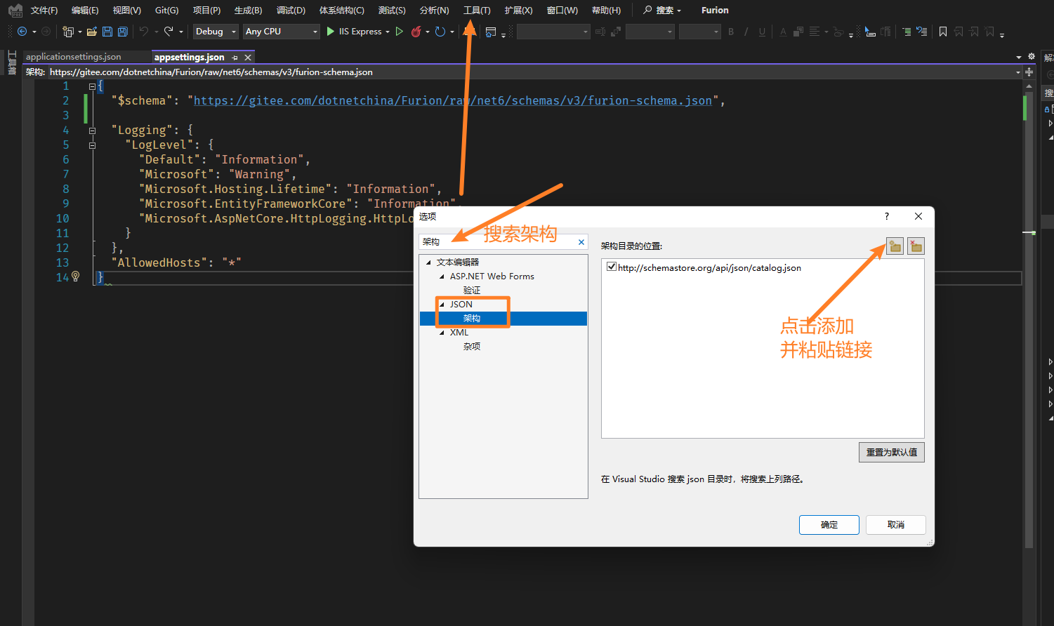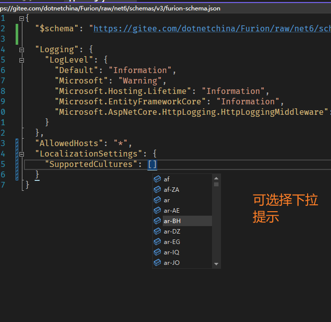 使用方式非常简单,只需要在 .json 文件的头部添加 "$schema": "https://gitee.com/dotnetchina/Furion/raw/v4/schemas/v4/furion-schema.json", 即可,如: