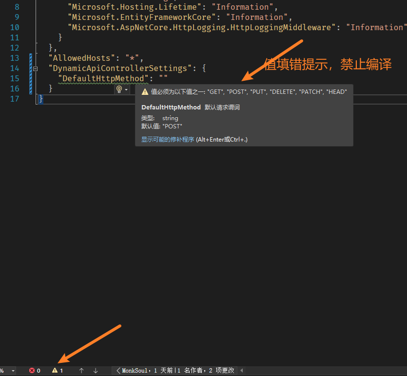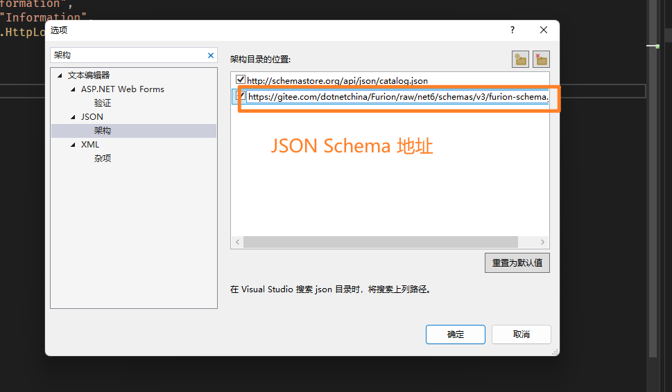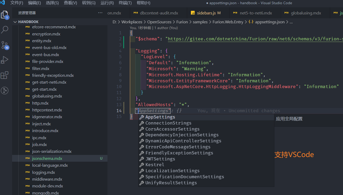 Furion 框架提供了完整的 Furion 和 ASP.NET Core 的 JSON Schema 文件,通过该文件可以在编写配置文件时提供完整的智能提示和校验。